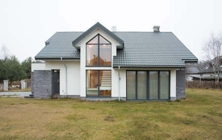 facade of a new plywood house residential window modern and shingle roof wall real work room