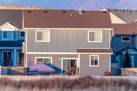 Backyard with fencing of simple two story house in American town, with withered grass in foreground