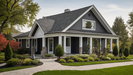 Modern Suburban House with Dark Gray Asphalt Shingles and Stone Facade on a Sunny Day. Concept of Modern Architecture, Stylish Living, Residential Homes, and Suburban Lifestyle.