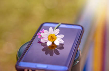 chamomile on the screen of this mobile, offering a beautiful reflection, context of being free