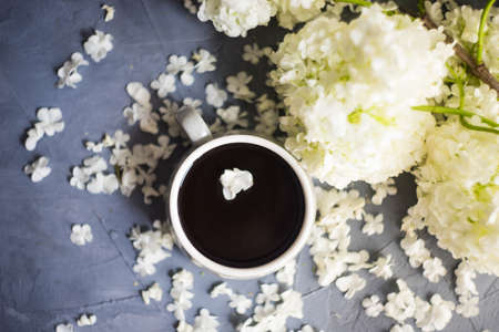 Cup of coffee and white Viburnum opulus 'Roseum' on rustic background