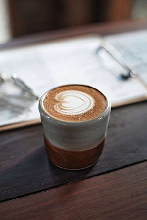 Hand taking a picture of hot latte art coffee cup with art foam on wooden table with her smart phone sitting at a coffee shop snap and share on social media by smartphone. Web Blogger photo shoot concept.
