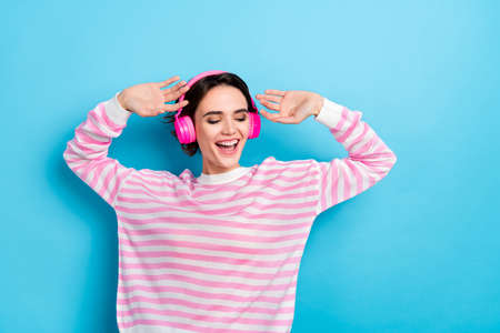 Portrait of funky cheerful female have fun discotheque listen music in wireless headset isolated on blue color background