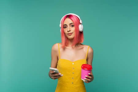 young woman with pink dyed hair listening music in headphones while holding paper cup and smartphone isolated on blue