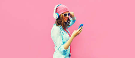 Summer colorful portrait of stylish modern young woman listening to music in headphones with smartphone on pink background