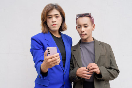 Gender inclusive Asian business team couple against white background