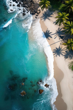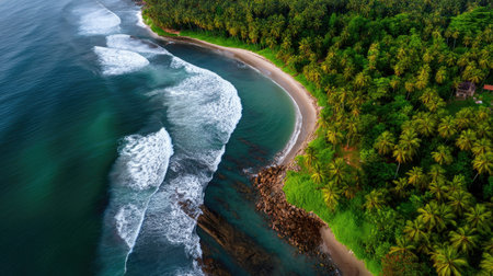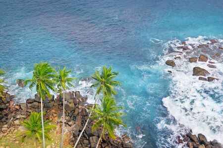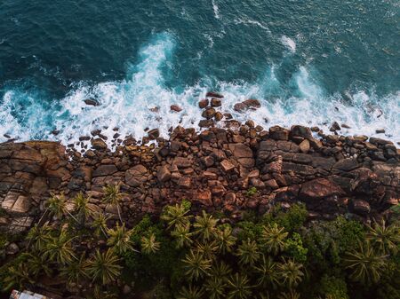 Aerial drone photo of tropical beach, sea rocks, turquoise ocean and palm trees in the Sri Lanka