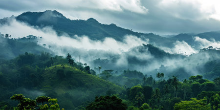 Tropical green mountains with mist. Cloudy foggy sky backdrop. Generative AI.