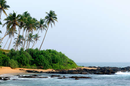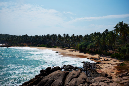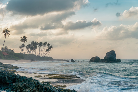 Tropical rocky beach with coconut palm trees, sandy beach and ocean. Tangalle, Southern Province, Sri Lanka, Asia.