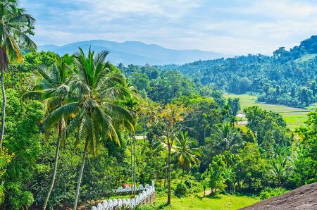 The picturesque landscape with the jungle forests of Udunuwara, perfectly seen from the Panhalgala Rock, Sri Lanka.