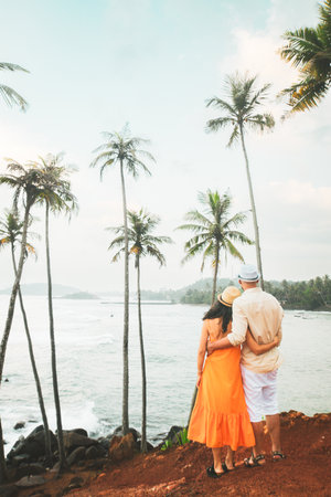 Couple stands on tropical cliff side watching ocean waves under tall coconut palms at sunset in southern Sri Lanka. Coconut island viewpoint. Famous sunset sunrise photo spot