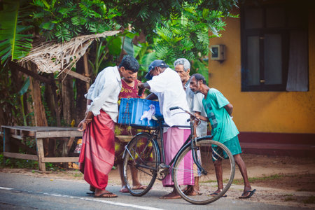 Ambalangoda, Sri Lanka - 02 February, 2017: Regular public Sri Lankan bus stop. Moring traffic in the city. Seller on the bike shows goods on the road