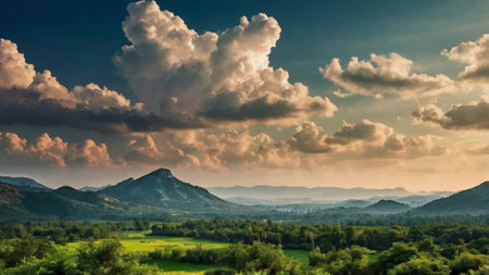 Landscape with mountains and clouds at sunset. Beautiful natural background.