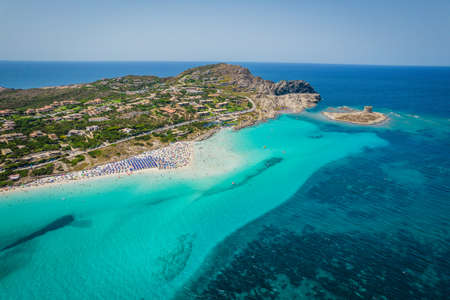 Aerial panoramic view of La Pelosa beach in Stintino, Sardinia with crystal clear turquoise water