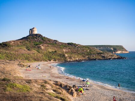 Sunset beach of San Giovanni di Sinis (Sardinia) and in the background the old tower.