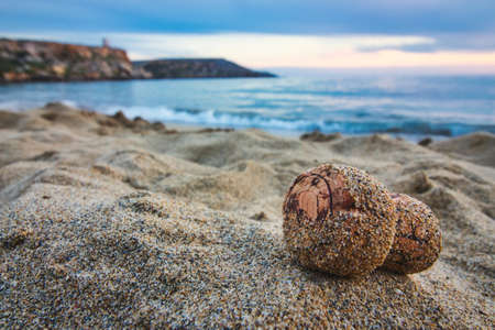 Close-up of champagne cork on a sandy beach with the sea in the background