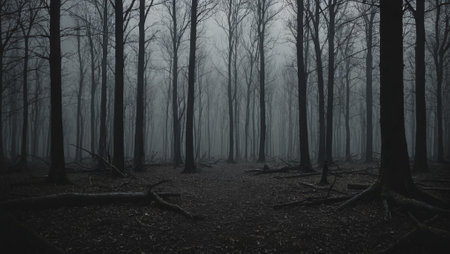 Gloomy Woodland Landscape, Misty Forest Trail, Spooky Halloween Scenery, Dense Forest, Dark and Mysterious, Halloween Themes, Eerie and Ominous, Bare Trees in Fog, Dark Woods Scene
