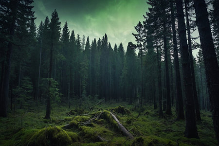 A dense, dark forest with towering pine trees, creating a mysterious and dramatic natural scene