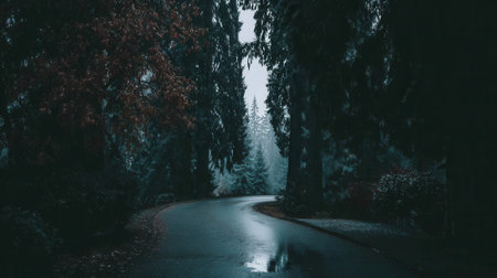 A wet asphalt road curves through a dense, dark forest under a gloomy sky. The moody, atmospheric scene evokes mystery, solitude, and the feeling of a journey into the unknown.