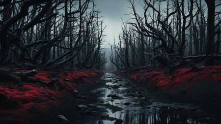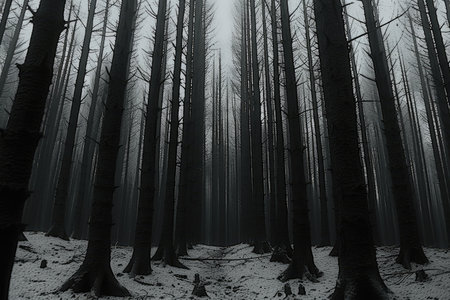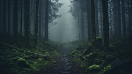 dark and mysterious forest with towering trees, a misty atmosphere, and a sense of foreboding. AI Generative
