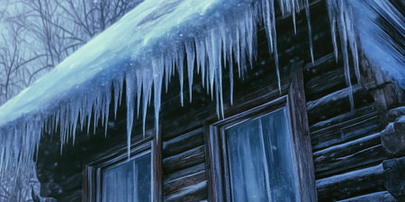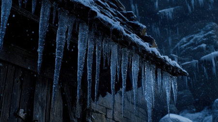 Capture the essence of winter with stunning icicles adorning a rustic cabin rooftop, set against a dark rocky background, evoking a serene, chilly atmosphere.