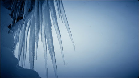 A captivating depiction of a frozen pipe adorned with icicles against a tranquil icy blue backdrop. Evokes the chill of winter and serene beauty.