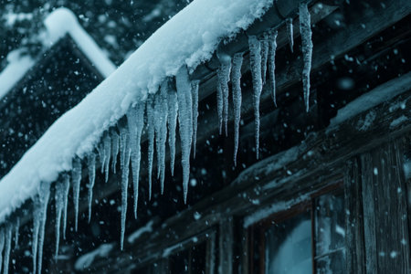 Long icicles form under a roof, reflecting the chilly atmosphere of a snow-covered mountain scene in the height of winter.