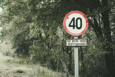 An old 40 Km / h speed limit road sign against green forest in the Chernobyl Exclusion Zone, Ukraine. Translation of the text: throughout the exclusion zone