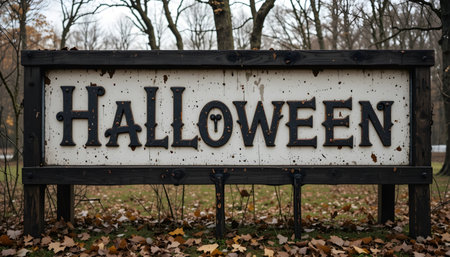 Full frame picture with skeleton holding an empty wooden sign in a cemetery. Halloween with Placard