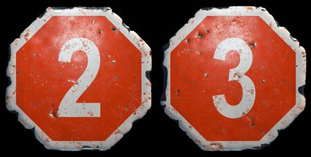 Set of numbers 2, 3 made of public road sign in red and white with a capital in the center isolated on black background. 3d rendering