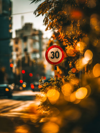 Warm evening glow bathes the busy boulevard, accented by string lights and a gentle speed restriction sign, capturing festive charm amid urban tranquility.