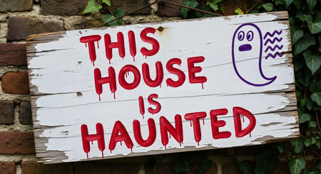 A spooky, handmade sign on a weathered white wooden board reads 'This House Is Haunted' in dripping red letters, next to a cartoon ghost. The sign hangs on a brick wall with ivy, creating a fun and scary Halloween decoration.