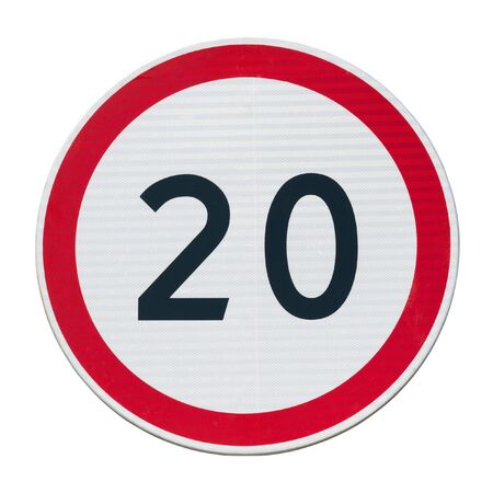 Speed restriction in city. Round speed limit traffic sign. Twenty kilometers per hour, 20 speed limit sign in city street