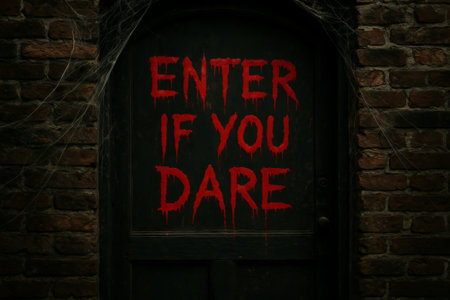 Dark cryptic door with enter if you dare message on brick wall background. concept of mystery, adventure, halloween atmosphere.