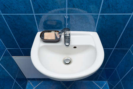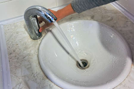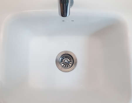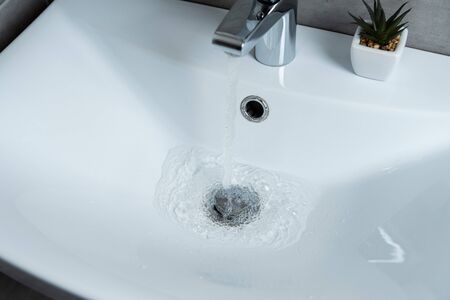 wash basin close-up, white wash basin close up, Detail of the basin, working water tap, water flowing from the tap in the sink close-up, Water tap flowing
