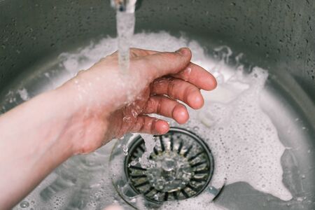 A woman washes dirty hands under running water. Hand under the tap with soapy water. Hand washing with soap