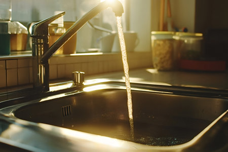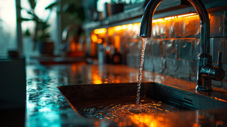 Water flowing from a modern faucet into a sleek stainless steel kitchen sink, illuminated by the warm glow of sunset light streaming through the window, creates a cozy atmosphere