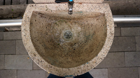 Rovigo, Italy 18 December 2025: modern chrome faucet with a single drip falling into a deep blue ceramic sink, highlighting water conservation and clean design