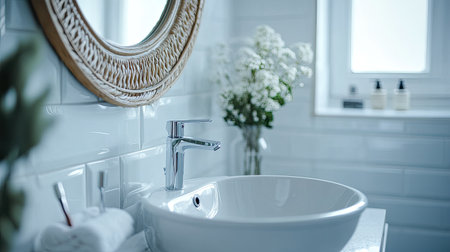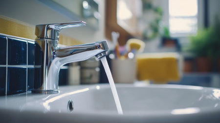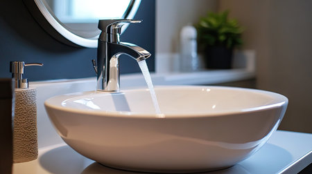 A sleek and modern faucet streams water in a bright bathroom. This photo captures the essence of bathroom decor, showcasing plumbing fixtures in a stylish setting.