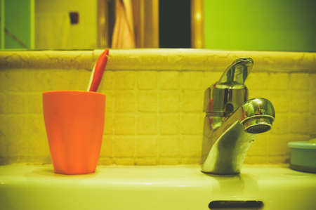 white sink with faucet, dispenser with liquid soap, shaving foam, safety razor and toothbrush