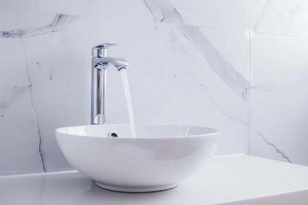 Discover a peaceful bathroom scene featuring a sleek white sink with running water, surrounded by elegant marble, perfect for home decoration or renovation inspiration.