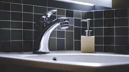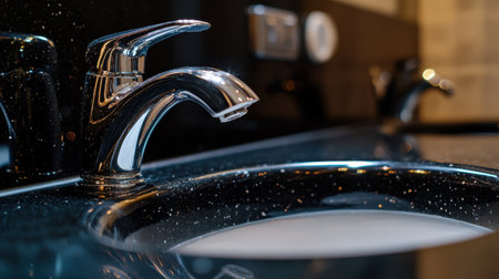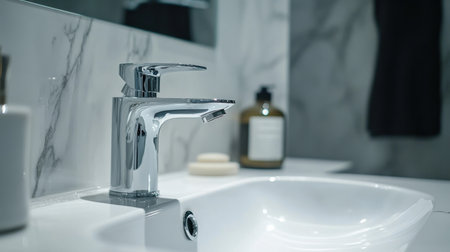 This image showcases a sleek chrome faucet in a modern bathroom setting. The close-up captures the elegant design and shiny finish, enhancing any decor.