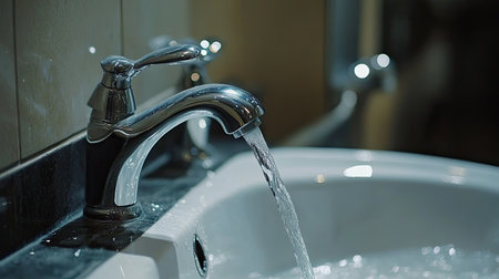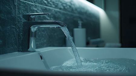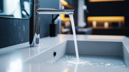 A stunning image showcasing a sleek modern faucet with water flowing over a stylish white sink in an elegant bathroom setting. The contemporary design enhances the atmosphere.