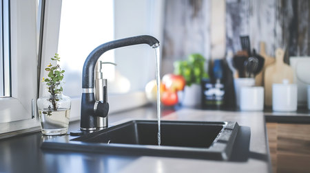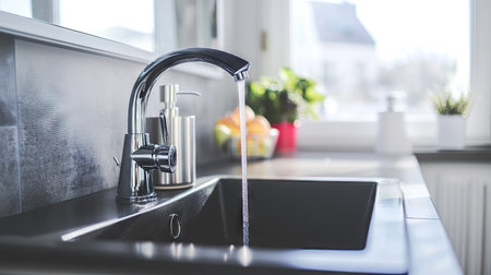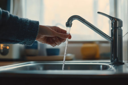 Water flows freely as a hand adjusts the kitchen faucet, symbolizing health and purity in home cooking.