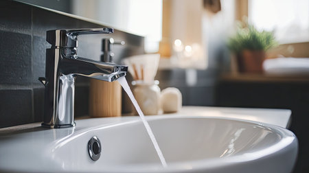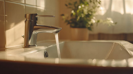 A sleek faucet emits a gentle stream of water in a stylish bathroom with natural light. The scene blends modern design with a touch of greenery, creating a serene atmosphere perfect for a contemporary home.