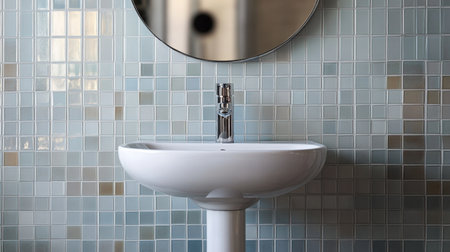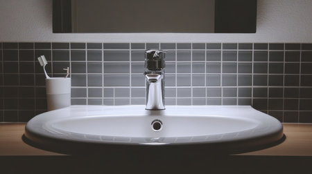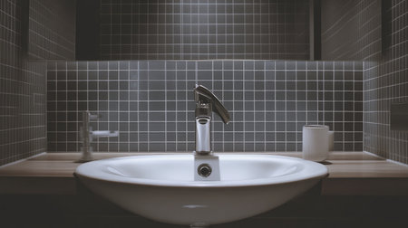 A modern and clean bathroom sink setup showcasing a sleek faucet, elegant tiles, and minimalist decor, perfect for contemporary interiors.