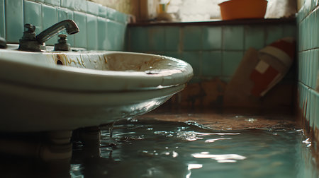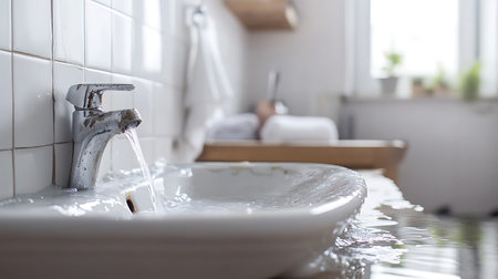 Water rushes over the edge of a sink in a bathroom creating splashes as it spills onto the floor. The scene captures the chaos of an unexpected plumbing issue.