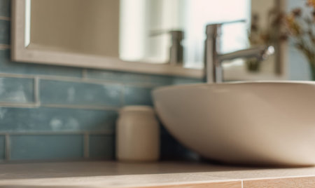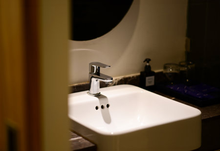 A contemporary bathroom scene featuring a sleek faucet over a clean sink, accentuated by soft ambient lighting and reflections, perfect for modern home decor inspiration.