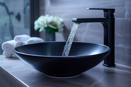 Close-up of a black round sink and a black matte faucet with flowing water. Minimalist interior design of a modern bathroom