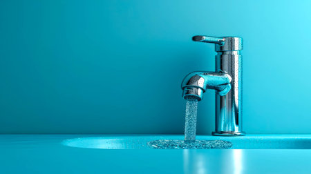 A stunning silver faucet pours clear water into a calm, blue surface, creating ripples and bubbles. The background features a refreshing, vibrant tile pattern. Transparent.